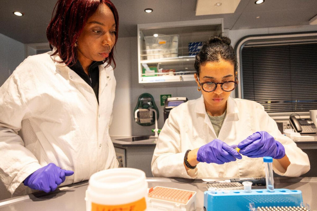 Early Career Explorers Aghogho Kolawole-Daniles and Omaima Mouiret working on their independent research in the DNA lab on OceanXplorer off the coast of West Africa